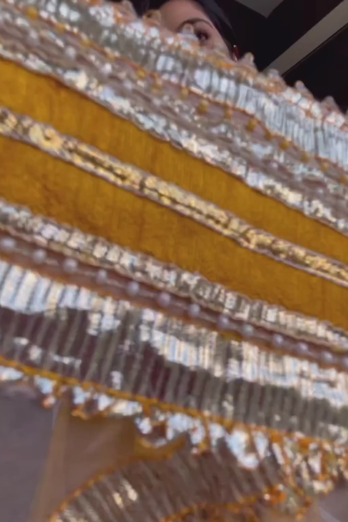 The Sadiyah ensemble from the Noor collection is made using a pure Chanderi Silk fabric, crafted with gotapatti and highlighted with basra moti. It features a Mandarin collar with a placket and three-quarter sleeves. The look comes together with a salwar and a silk organza dupatta. The outfit is finished using an exclusive Chanderi Silk Banarsi fabric and Pearls.