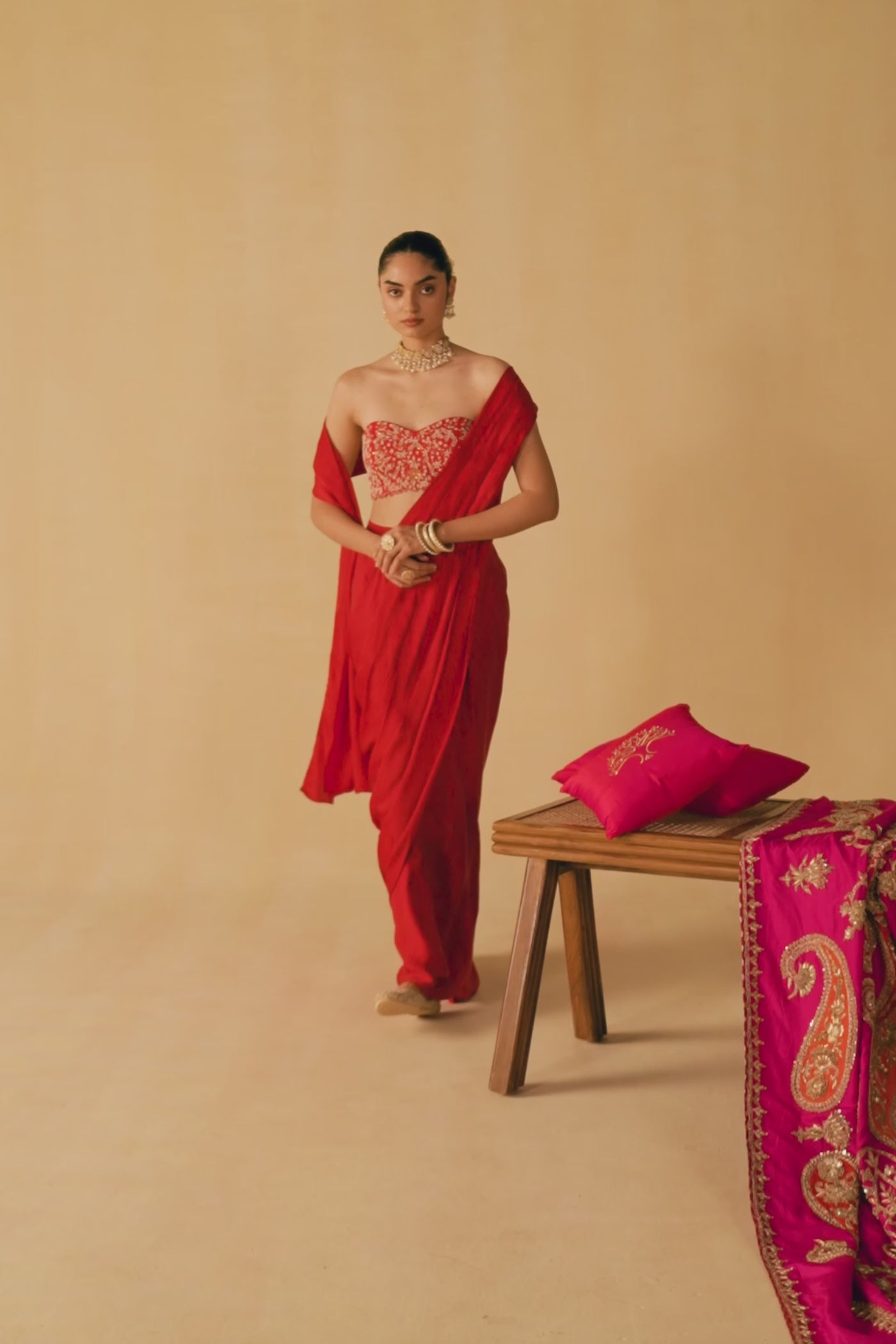 Our celestial Rumaan pre-stitched Saree, woven from the threads of Bamberg Satin, adorns itself with a hand-embroidered Dabka Zardozdi Blouse, embellished with a belt.