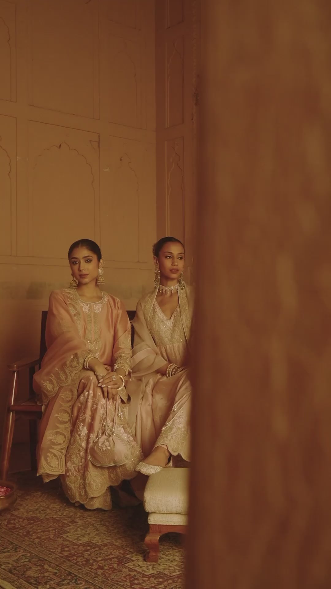The long ankle length kalidaar anarkali is made in pure silk chanderi fabric and is teamed up with a chooridaar and a silk organza dupatta. The outfit has a broad V neck at the front, a zero back and elbow sleeves. The outfit is adorned with Kashmiri Tilla and Parsi Gara embroidery, while also being highlighted with Basra Moti's. The outfit is finally finished with delicate scallop detailing.