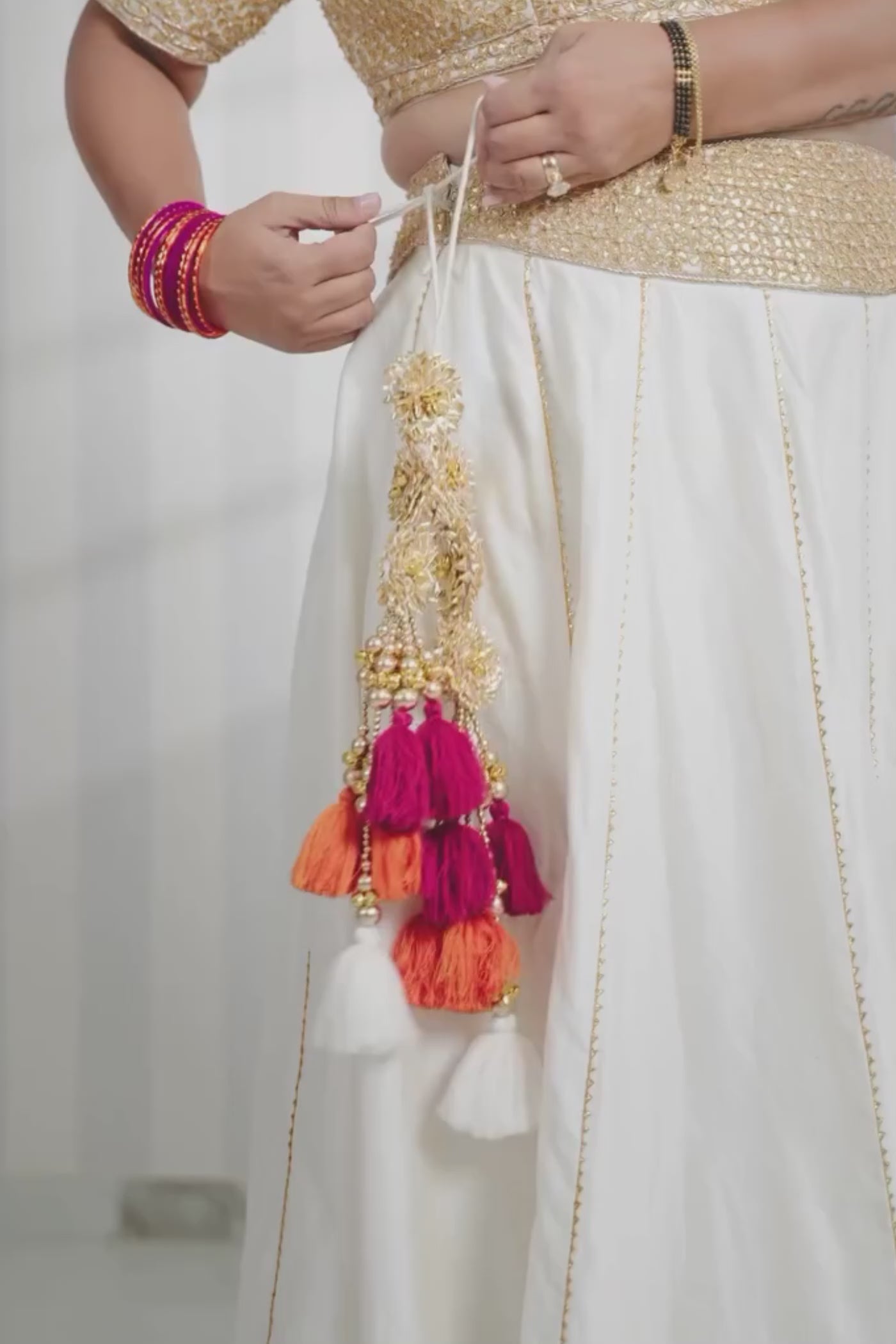 The Aarif ensemble showcases intricate hand work on a lehenga, made in pure Silk Chanderi fabric. This luxurious and comfortable fabric is embellished with heritage Gota Patti and Dabka Zardozi Embroidery. The blouse features a zero neck at the front, and is tied with a dori on the back. The outfit is highlighted with basra moti's. It is finished with an exclusive Pure Banarsi fabric and gota detailing. The blouse for the outfit can be customised at no additional charges. Please reach out to our customer care team. This outfit is dedicated to Aarif, our talented artisan and his team who worked over 200 hours to embroider this ensemble by hand.